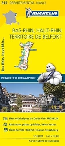 Carte départementale n° 315 - Bas-Rhin, Haut-Rhin ~ Carte routière du Bas-Rhin, Haut-Rhin et du Territoire de Belfort éditée par Michelin. Carte détaillée incluant un index des localités, des suggestions d'itinéraires, les pistes cyclables et Voies Vertes. Sélection des plus beaux sites. Petit plan de Belfort, Colmar et Strasbourg en encart. Echelle 1/150 000 (1 cm = 1