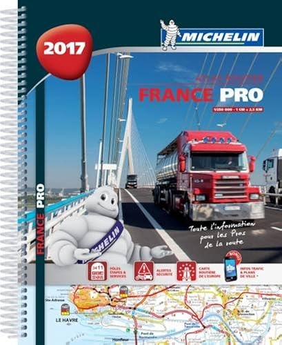 Atlas routier France PRO 2017 : sécurité et confort sur les routes de France pour tous les PROS !Fiable et pratique, l'atlas France 2017 PRO de la route au 1/250 000 (1cm = 2,5km) vous accompagne dans tous vos déplacements. Vous retrouvez toutes les informations indispensables pour vos trajets : visualisation de tous les Pôles "Etapes et Services" avec liste complète des services (sanitaires, alimentation, Wifi...), carte routière de l'Europe, les Alertes Sécurité Michelin (parcours dangereux, limite de charge et de hauteurs, cols...).Bénéficiez d'une navigation simplifiée grâce à un QR code présent sur chaque page permettant à tout moment de visualiser le trafic sur votre parcours. Enfin, parcourez le pages dédiées à des exercices physiques pour rester en forme au fil des kilomètres!